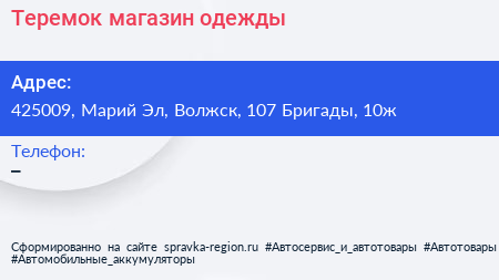 Теремок, магазин одежды по адресу 425009, Марий Эл, Волжск, 107 Бригады, 10ж в дальнейшем Организация, размещена в следующих категориях: