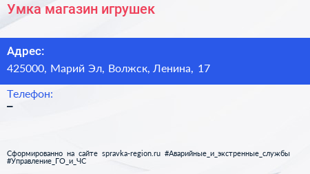 Умка, магазин игрушек по адресу 425000, Марий Эл, Волжск, Ленина, 17 в дальнейшем Организация, размещена в следующих категориях: