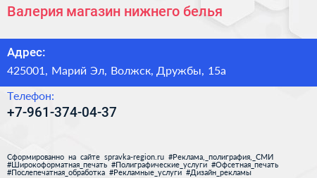 Валерия, магазин нижнего белья по адресу 425001, Марий Эл, Волжск, Дружбы, 15а в дальнейшем Организация, размещена в следующих категориях: