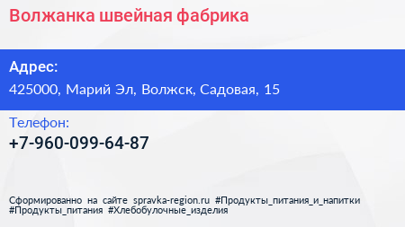 Волжанка, швейная фабрика по адресу 425000, Марий Эл, Волжск, Садовая, 15 в дальнейшем Организация, размещена в следующих категориях: