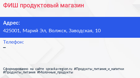 ФИШ, продуктовый магазин по адресу 425001, Марий Эл, Волжск, Заводская, 10 в дальнейшем Организация, размещена в следующих категориях: