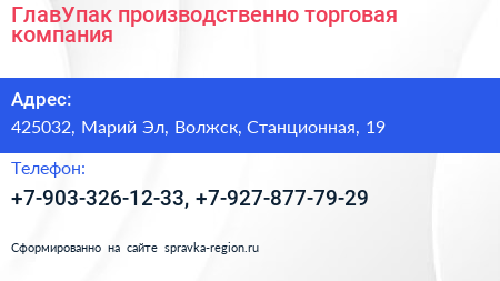 ГлавУпак, производственно-торговая компания по адресу 425032, Марий Эл, Волжск, Станционная, 19 в дальнейшем Организация, размещена в следующих категориях: