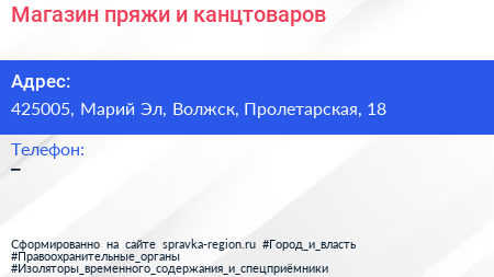 Магазин пряжи и канцтоваров по адресу 425005, Марий Эл, Волжск, Пролетарская, 18 в дальнейшем Организация, размещена в следующих категориях: