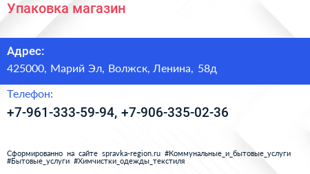 Упаковка, магазин по адресу 425000, Марий Эл, Волжск, Ленина, 58д в дальнейшем Организация, размещена в следующих категориях: