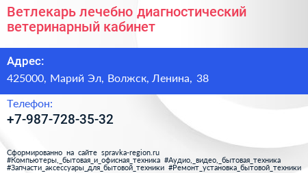 Ветлекарь, лечебно-диагностический ветеринарный кабинет по адресу 425000, Марий Эл, Волжск, Ленина, 38 в дальнейшем Организация, размещена в следующих категориях: