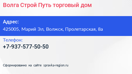 Волга Строй Путь, торговый дом по адресу 425005, Марий Эл, Волжск, Пролетарская, 8а в дальнейшем Организация, размещена в следующих категориях: