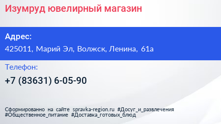 Изумруд, ювелирный магазин по адресу 425011, Марий Эл, Волжск, Ленина, 61а в дальнейшем Организация, размещена в следующих категориях: