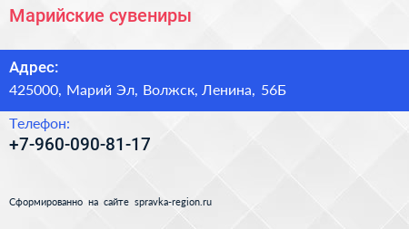 Марийские сувениры по адресу 425000, Марий Эл, Волжск, Ленина, 56Б в дальнейшем Организация, размещена в следующих категориях: