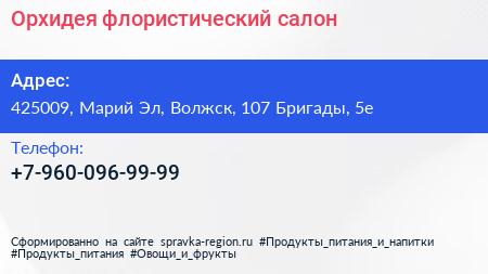 Орхидея, флористический салон по адресу 425009, Марий Эл, Волжск, 107 Бригады, 5е в дальнейшем Организация, размещена в следующих категориях: