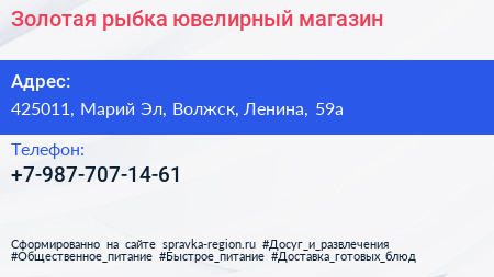 Золотая рыбка, ювелирный магазин по адресу 425011, Марий Эл, Волжск, Ленина, 59а в дальнейшем Организация, размещена в следующих категориях:
