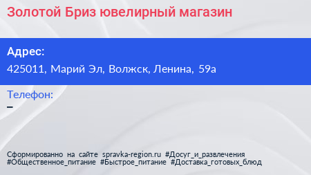 Золотой Бриз, ювелирный магазин по адресу 425011, Марий Эл, Волжск, Ленина, 59а в дальнейшем Организация, размещена в следующих категориях: