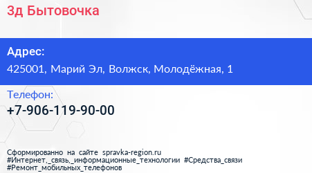 3д Бытовочка по адресу 425001, Марий Эл, Волжск, Молодёжная, 1 в дальнейшем Организация, размещена в следующих категориях: