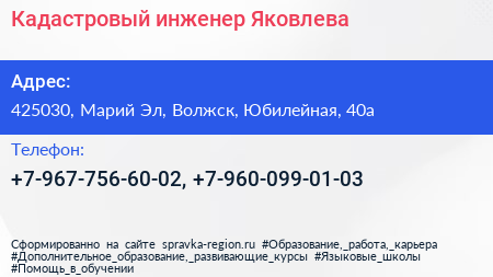 Кадастровый инженер Яковлева по адресу 425030, Марий Эл, Волжск, Юбилейная, 40а в дальнейшем Организация, размещена в следующих категориях: