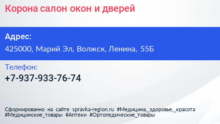 Корона, салон окон и дверей по адресу 425000, Марий Эл, Волжск, Ленина, 55Б в дальнейшем Организация, размещена в следующих категориях: