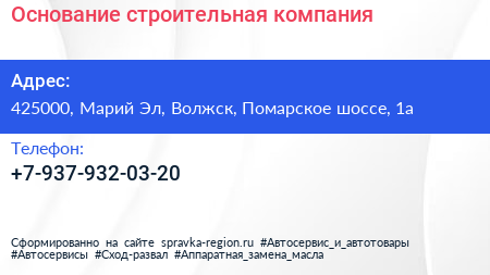 Основание, строительная компания по адресу 425000, Марий Эл, Волжск, Помарское шоссе, 1а в дальнейшем Организация, размещена в следующих категориях: