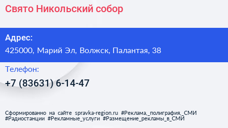 Свято-Никольский собор по адресу 425000, Марий Эл, Волжск, Палантая, 38 в дальнейшем Организация, размещена в следующих категориях: