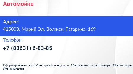 Автомойка по адресу 425003, Марий Эл, Волжск, Гагарина, 169 в дальнейшем Организация, размещена в следующих категориях: