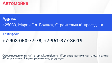 Автомойка по адресу 425030, Марий Эл, Волжск, Строительный проезд, 1а в дальнейшем Организация, размещена в следующих категориях: