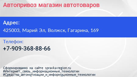 Автопривоз, магазин автотоваров по адресу 425003, Марий Эл, Волжск, Гагарина, 169 в дальнейшем Организация, размещена в следующих категориях: