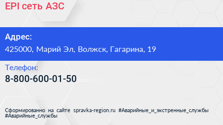 EPI, сеть АЗС по адресу 425000, Марий Эл, Волжск, Гагарина, 19 в дальнейшем Организация, размещена в следующих категориях: