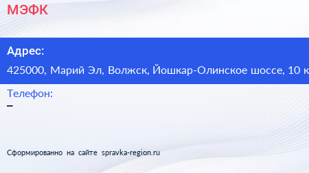 МЭФК по адресу 425000, Марий Эл, Волжск, Йошкар-Олинское шоссе, 10 к1 в дальнейшем Организация, размещена в следующих категориях: