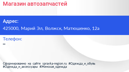 Магазин автозапчастей по адресу 425000, Марий Эл, Волжск, Матюшенко, 12а в дальнейшем Организация, размещена в следующих категориях: