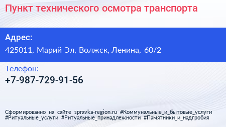 Пункт технического осмотра транспорта по адресу 425011, Марий Эл, Волжск, Ленина, 60/2 в дальнейшем Организация, размещена в следующих категориях: