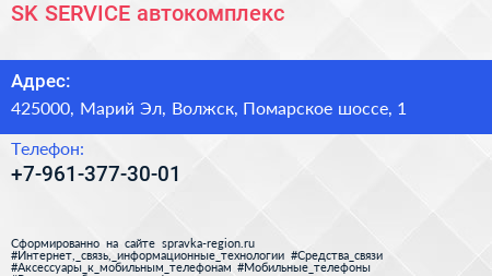SK SERVICE, автокомплекс по адресу 425000, Марий Эл, Волжск, Помарское шоссе, 1 в дальнейшем Организация, размещена в следующих категориях: