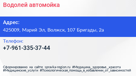 Водолей, автомойка по адресу 425009, Марий Эл, Волжск, 107 Бригады, 2а в дальнейшем Организация, размещена в следующих категориях: