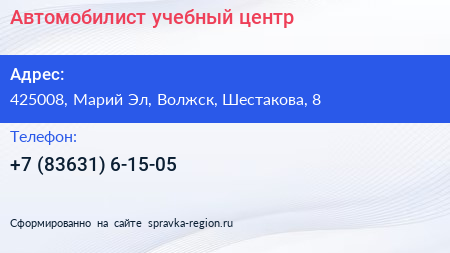 Автомобилист, учебный центр по адресу 425008, Марий Эл, Волжск, Шестакова, 8 в дальнейшем Организация, размещена в следующих категориях: