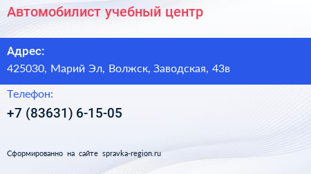 Автомобилист, учебный центр по адресу 425030, Марий Эл, Волжск, Заводская, 43в в дальнейшем Организация, размещена в следующих категориях: