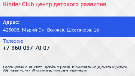 Kinder Club, центр детского развития по адресу 425008, Марий Эл, Волжск, Шестакова, 16 в дальнейшем Организация, размещена в следующих категориях: