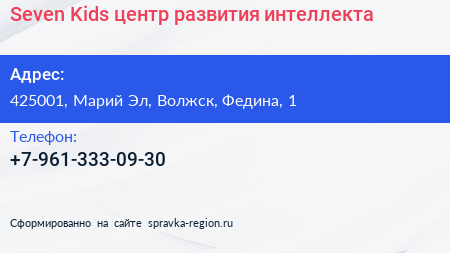 Seven Kids, центр развития интеллекта по адресу 425001, Марий Эл, Волжск, Федина, 1 в дальнейшем Организация, размещена в следующих категориях: