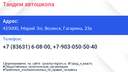 Тандем, автошкола по адресу 425000, Марий Эл, Волжск, Гагарина, 23а в дальнейшем Организация, размещена в следующих категориях: