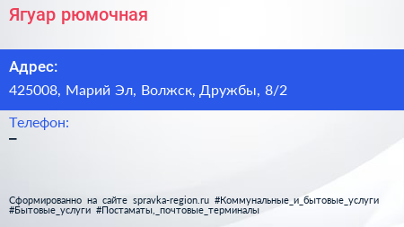 Ягуар, рюмочная по адресу 425008, Марий Эл, Волжск, Дружбы, 8/2 в дальнейшем Организация, размещена в следующих категориях: