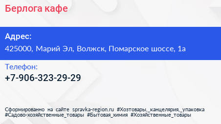Берлога, кафе по адресу 425000, Марий Эл, Волжск, Помарское шоссе, 1а в дальнейшем Организация, размещена в следующих категориях: