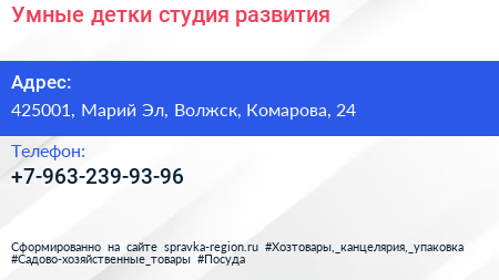 Умные детки, студия развития по адресу 425001, Марий Эл, Волжск, Комарова, 24 в дальнейшем Организация, размещена в следующих категориях: