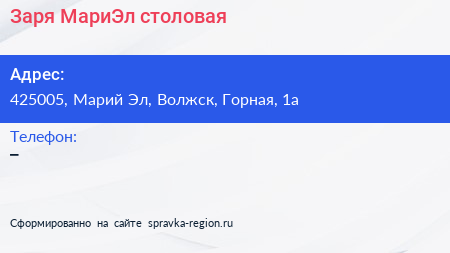 Заря-МариЭл, столовая по адресу 425005, Марий Эл, Волжск, Горная, 1а в дальнейшем Организация, размещена в следующих категориях: