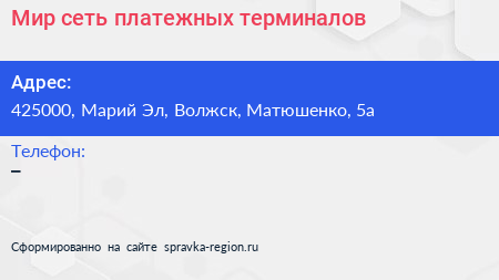 Мир, сеть платежных терминалов по адресу 425000, Марий Эл, Волжск, Матюшенко, 5а в дальнейшем Организация, размещена в следующих категориях: