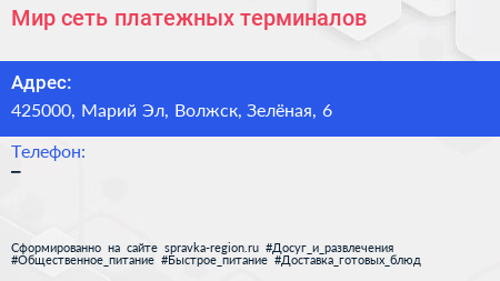 Мир, сеть платежных терминалов по адресу 425000, Марий Эл, Волжск, Зелёная, 6 в дальнейшем Организация, размещена в следующих категориях: