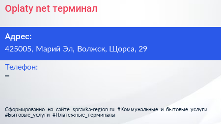 Oplaty.net, терминал по адресу 425005, Марий Эл, Волжск, Щорса, 29 в дальнейшем Организация, размещена в следующих категориях: