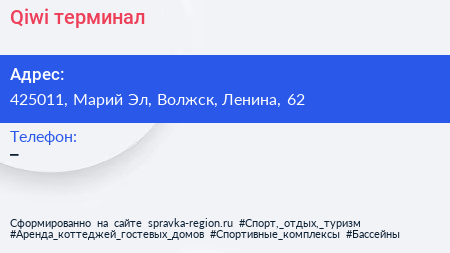 Qiwi, терминал по адресу 425011, Марий Эл, Волжск, Ленина, 62 в дальнейшем Организация, размещена в следующих категориях:
