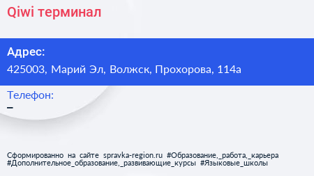 Qiwi, терминал по адресу 425003, Марий Эл, Волжск, Прохорова, 114а в дальнейшем Организация, размещена в следующих категориях: