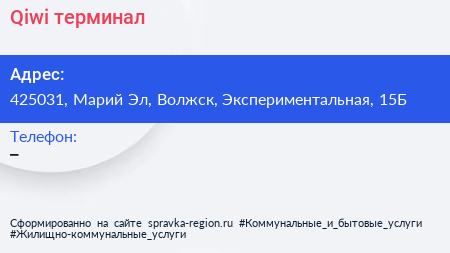 Qiwi, терминал по адресу 425031, Марий Эл, Волжск, Экспериментальная, 15Б в дальнейшем Организация, размещена в следующих категориях: