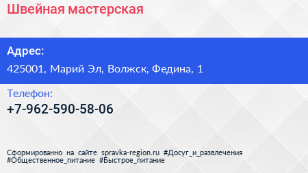 Швейная мастерская по адресу 425001, Марий Эл, Волжск, Федина, 1 в дальнейшем Организация, размещена в следующих категориях: