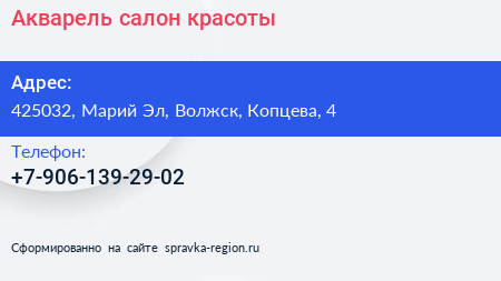 Акварель, салон красоты по адресу 425032, Марий Эл, Волжск, Копцева, 4 в дальнейшем Организация, размещена в следующих категориях: