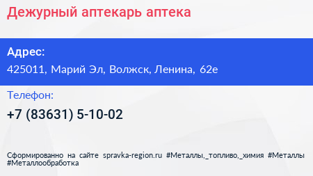 Дежурный аптекарь, аптека по адресу 425011, Марий Эл, Волжск, Ленина, 62е в дальнейшем Организация, размещена в следующих категориях: