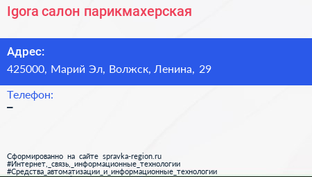 Igora, салон-парикмахерская по адресу 425000, Марий Эл, Волжск, Ленина, 29 в дальнейшем Организация, размещена в следующих категориях: