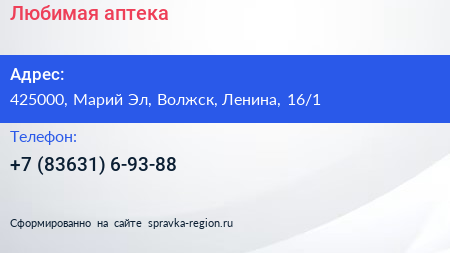 Любимая аптека по адресу 425000, Марий Эл, Волжск, Ленина, 16/1 в дальнейшем Организация, размещена в следующих категориях: