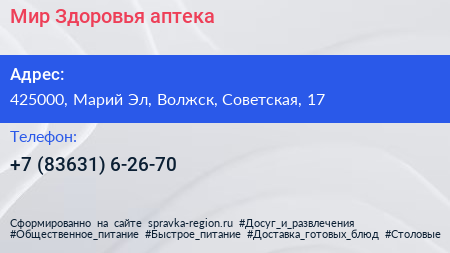 Мир Здоровья, аптека по адресу 425000, Марий Эл, Волжск, Советская, 17 в дальнейшем Организация, размещена в следующих категориях:
